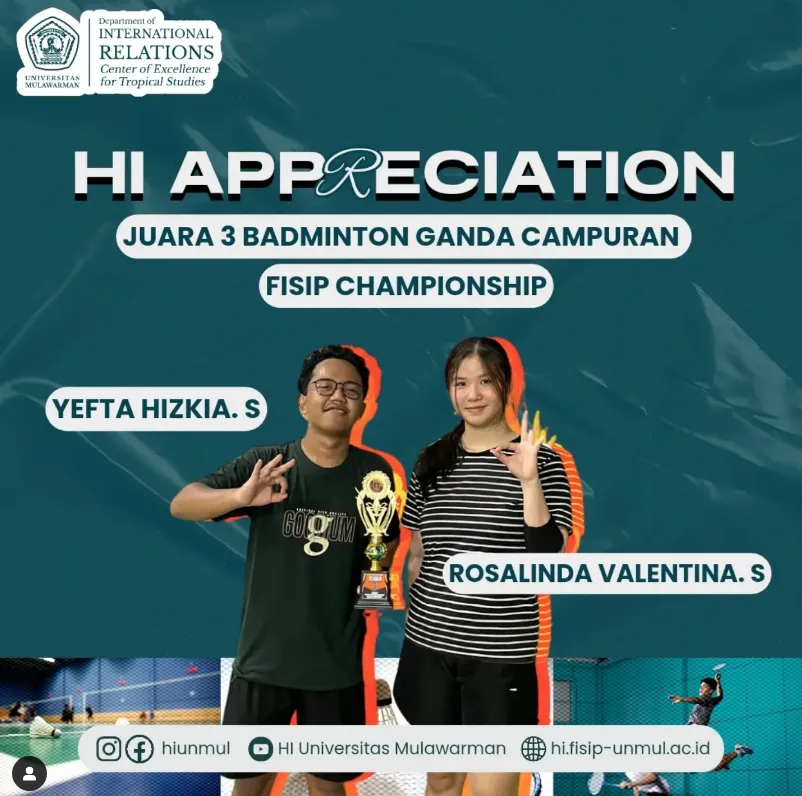 Selanat kepada Rosalinda Valentina. S dan Yefta Hizkia. S atas diraihnya Juara 3 Badminton Ganda Campuran dalam FISIP Championship 2024. Semoga bisa terus menjuarai kejuaraan badminton lainnya ya, tetap semangat.