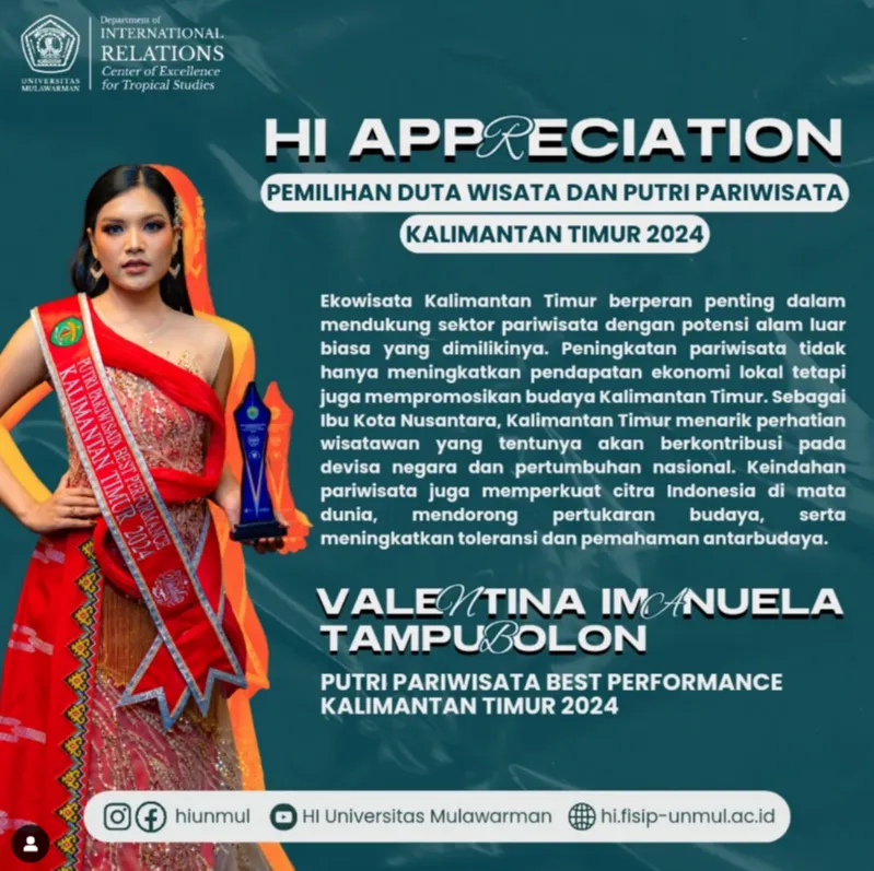 Selamat kepada Valentina Imanuela Tampubolon atas pencapaiannya sebagai Putri Pariwisata Best Performance Kalimantan Timur 2024 dalam ajang Pemilihan Duta Wisata dan Putri Pariwisata Kalimantan Timur 2024. Valen juga membagikan sedikit insight tentang pentingnya pariwisata Kalimantan Timur yang berkontribusi pada devisa negara dan pertumbuhan nasional. Yuk ikut berpartisipasi dalam meningkatkan pariwisata di Kalimantan Timur.
