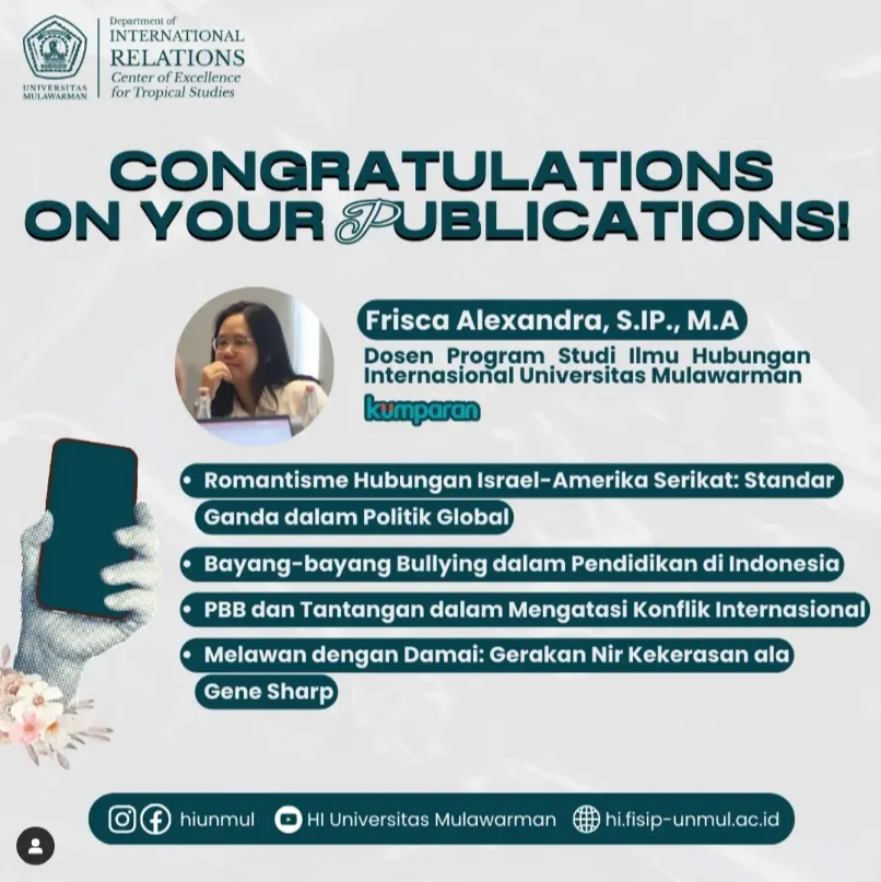 Publikasi bagi akademisi merupakan aspek penting dalam dunia pendidikan dan penelitian. Melalui platform Kumparan, salah satu dosen Program Studi Hubungan Internasional Universitas Mulawarman yang kerap disapa Kak Frisca baru saja mempublikasikan beberapa artikel yang bisa anda akses kapan saja dan dimana saja. Semoga bisa terus menginspirasi.