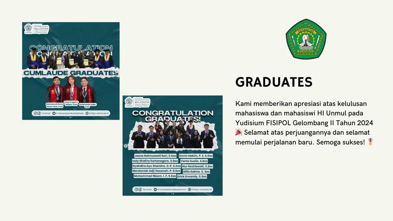 Kami memberikan apresiasi atas kelulusan mahasiswa dan mahasiswi HI Universitas Mulawarman pada Yudisium Fakultas Ilmu Sosial dan Ilmu Politik Gelombang II Tahun 2024. Selamat atas perjuangannya dan selamat memulai perjalanan baru. Semoga sukses.